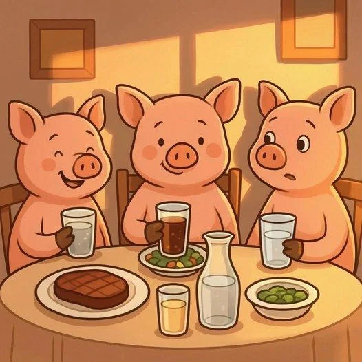 One cheerful evening, the Three Little Pigs decided to step away from their busy routines and enjoy dinner together at